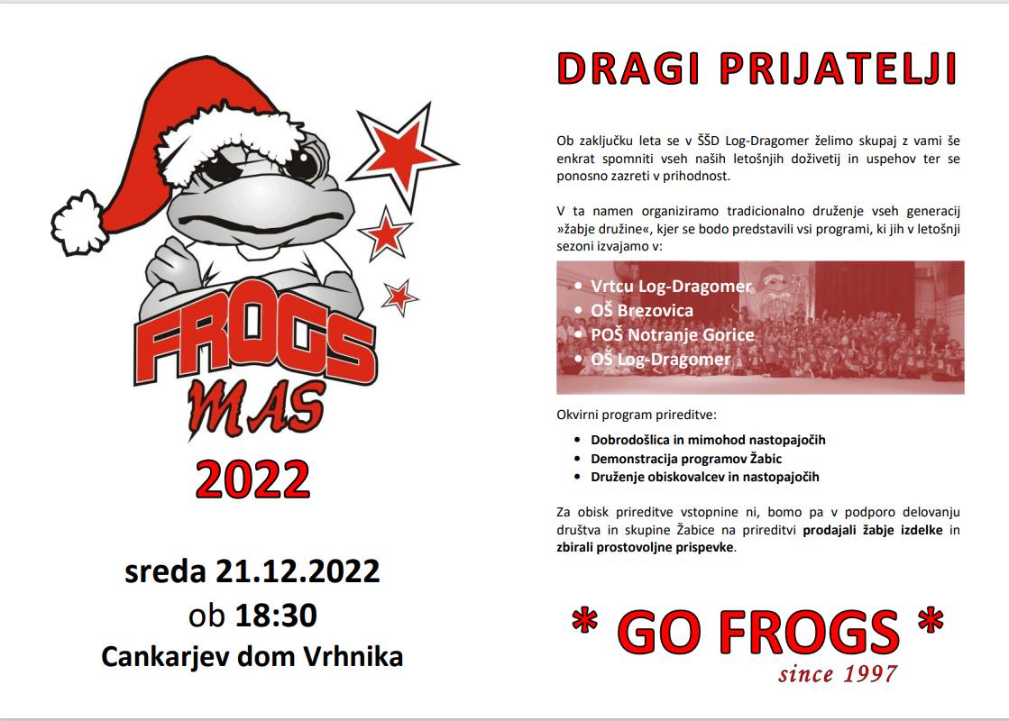 Po dveh letih premora se spet dobimo na naši božični prireditvi Frogsmas 2022. Potekala bo v sredo, 21. decembra 2022, ob 18.30 v Cankarjevem domu na Vrhniki. Za obisk prireditve vstopnine ni.