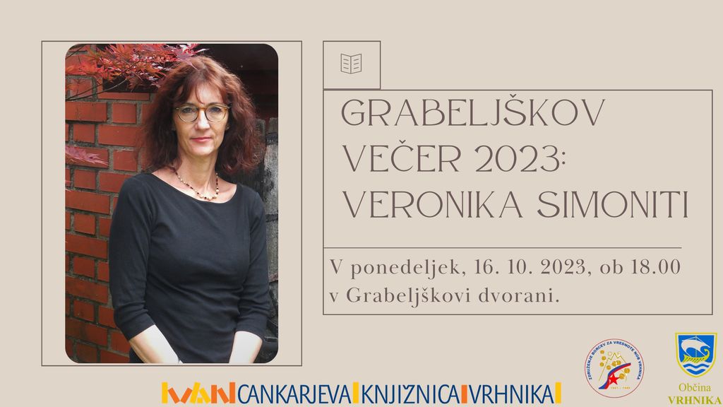 V sodelovanju z ZB NOB Vrhnika organiziramo tradicionalni Grabeljškov večer. Letošnja gostja bo Veronika Simoniti, slovenska prevajalka in pisateljica. Na ljubljanski Filozofski fakulteti je diplomirala iz italijanskega in francoskega jezika. Kot pisateljica se je začela uveljavljati s pravljicami, ki jih je pošiljala na Radio Slovenija.