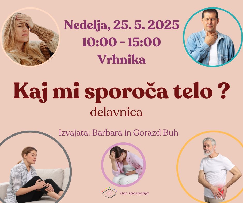 5 urna delavnica je namenjena vsem, ki izkušate bolezen, vnetja, kronične bolečine, tesnobo ali druge telesne simptome in vas zanima Zakaj je to potrebno oziroma Kaj vam s simptomi sporoča telo (kateri del vas in vašega Življenja telo na tak način pravzaprav zdravi) in Kako ga lahko podprete?