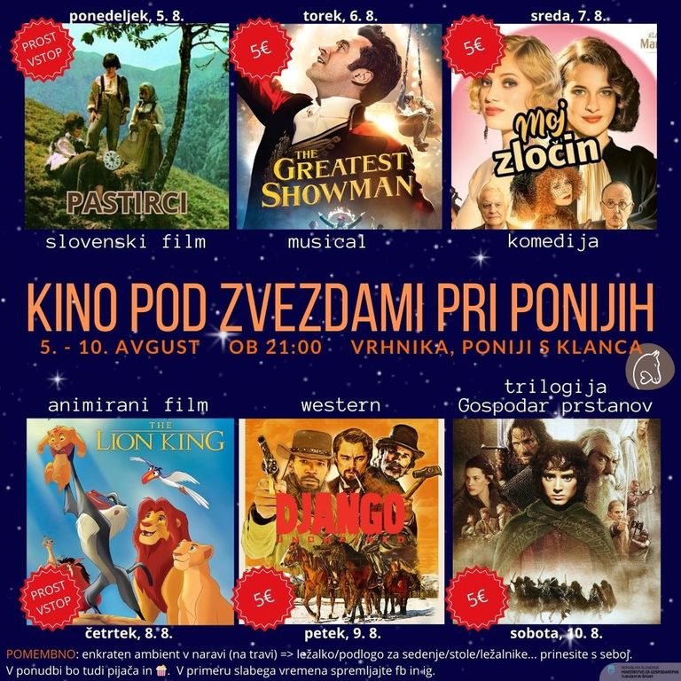 V tednu med 5. in 10. avgustom 2024, se bo v Inkluzivnem parku 1890 na Sveti Trojici na Vrhniki, odvijal teden kina pod zvezdami. Vsak večer, ob 21. uri, v naravnem amfiteatru, ki ga obkrožajo pašniki in gozd, se boste lahko potopili v čudovite svetove večnih filmskih uspešnic. Vse kar potrebujete, je udobna podlaga za ležanje, morda blazina ali dve in v primeru bolj hladnih poletnih noči, prijetna deka. Pijačo in prigrizke pa boste našli na stojnicah.