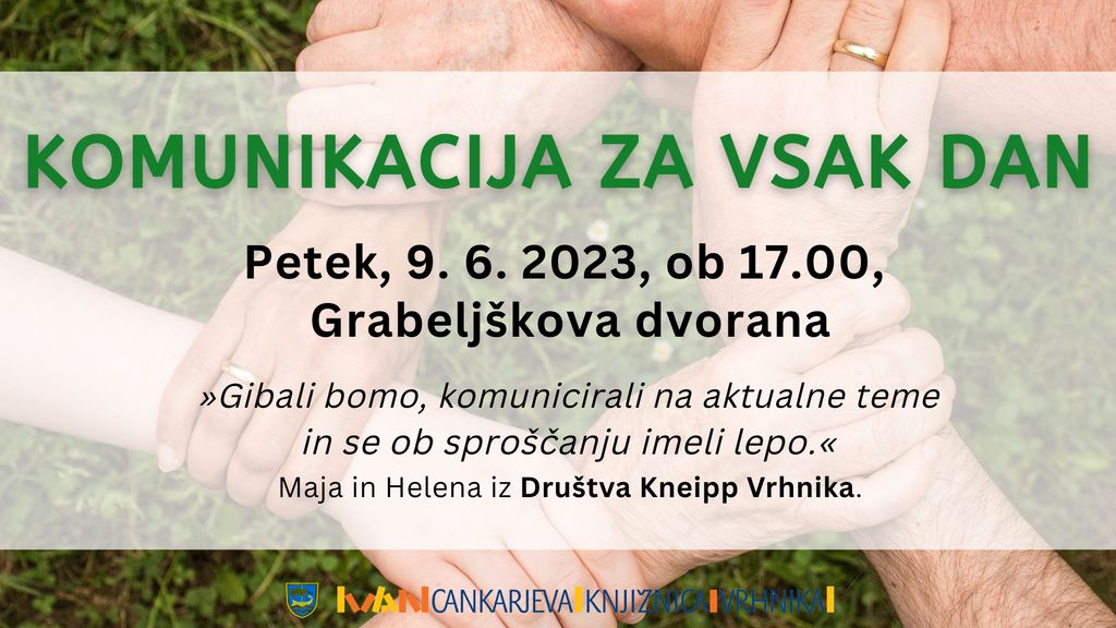 Vabljeni na dogodke, ki jih bo organiziralo Društvo Kneipp Vrhnika. »Gibali bomo, komunicirali na aktualne teme in se ob sproščanju imeli lepo.« Maja in Helena iz Društva Kneipp Vrhnika. Tokratna tema bo družina in odnosi v njej. V juniju: petek, 9. 6. 2023, ob 17.00 v Grabeljškovi dvorani.