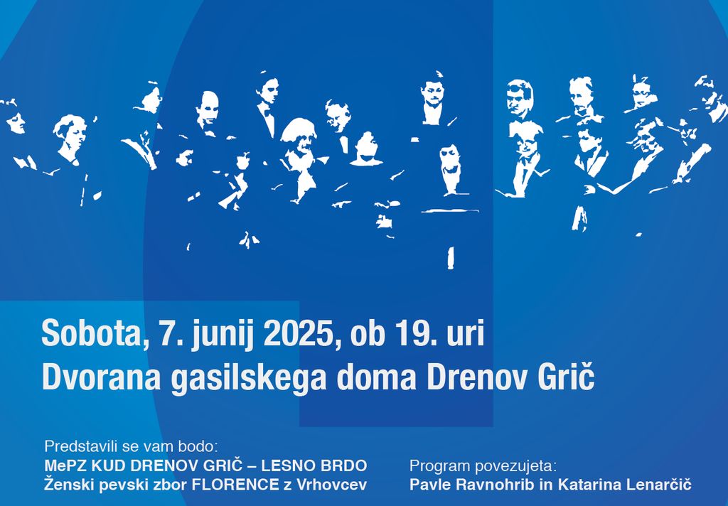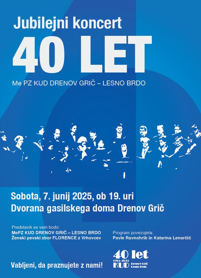 Prisrčno vabljeni na jubilejni koncert mešanega pevskega zbora, ki deluje v okviru Kulturno umetniškega društva Drenov Grič - Lesno Brdo. Društvo je bilo ustanovljeno daljnega leta 1985 ravno na pobudo ljubiteljev petja (nekateri pojejo v zboru neprekinjeno že od začetka do danes), zato je pevski zbor že štiri desetletja osrednji steber društva.