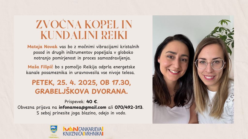 Vabljeni na magično doživetje za vaše telo, dušo in um. Mateja Novak vas bo z močnimi vibracijami kristalnih posod in drugih inštrumentov popeljala v globoko notranjo pomirjenost in proces samozdravljenja. Maša Filipič bo s pomočjo Reikija odprla energetske kanale posameznika in uravnovesila vse nivoje telesa. S seboj prinesite joga blazino, odejo in vodo, da bo izkušnja čim bolj prijetna in udobna. Prispevek je 40 €, število mest je omejeno. Obvezna prijava na infonamea@gmail.com ali 070/492-313. Se vidimo v Grabeljškovi dvorani v petek, 25. 4. 2025, ob 17.30. Naj se zgodi v vaše najvišje dobro.