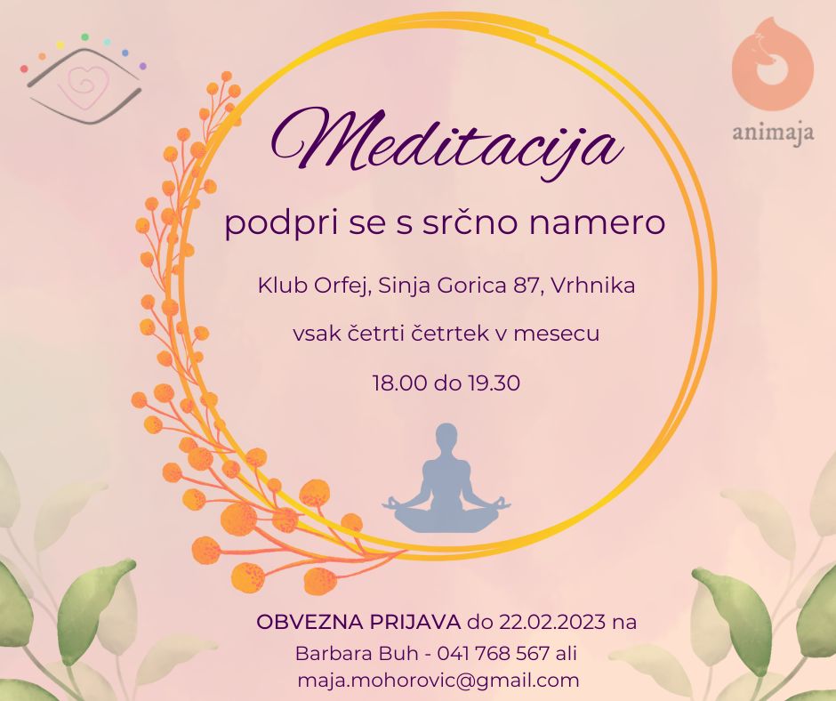 V četrtek, 23. 2. 2023, se bo v Klubu Orfej (Sinja Gorica 87, Vrhnika) zgodila MEDITACIJA "PODPRI SE S SRČNO NAMERO"