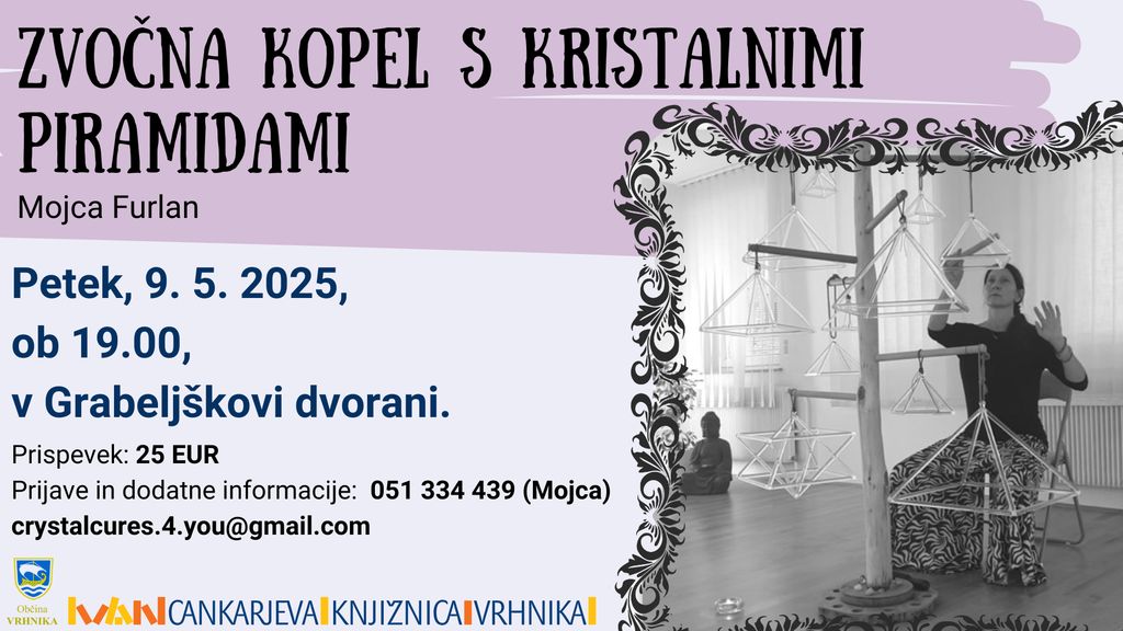 Mojca Furlan je akademska glasbenica pianistka, spec. pomoči z umetnostjo in glasbena terapevtka, raziskovalka duhovnih razsežnosti našega obstoja. Zvočna kopel s kristalnimi piramidami je nežna, sproščujoča, a zelo globoko transformativna izkušnja. Kristalni zvok prodira skozi celične membrane, harmonizira in zdravi na fizičnem nivoju točno tam, kjer oseba v danem trenutku najbolj potrebuje. Višja frekvenca postopno izpodriva in transformira stare zapise ter globoko karmično zasidrane programe, ki so različni pri vsakem posamezniku. S seboj prinesite mehko podlogo za ležanje, odejo, vzglavnik, vodo. Prispevek: 25 eur, število mest je omejeno. Prijave in dodatne informacije: 051 334 439 (Mojca), crystalcures.4.you@gmail.com. Petek, 9. 5. 2025, ob 19.00 v Grabeljškovi dvorani.