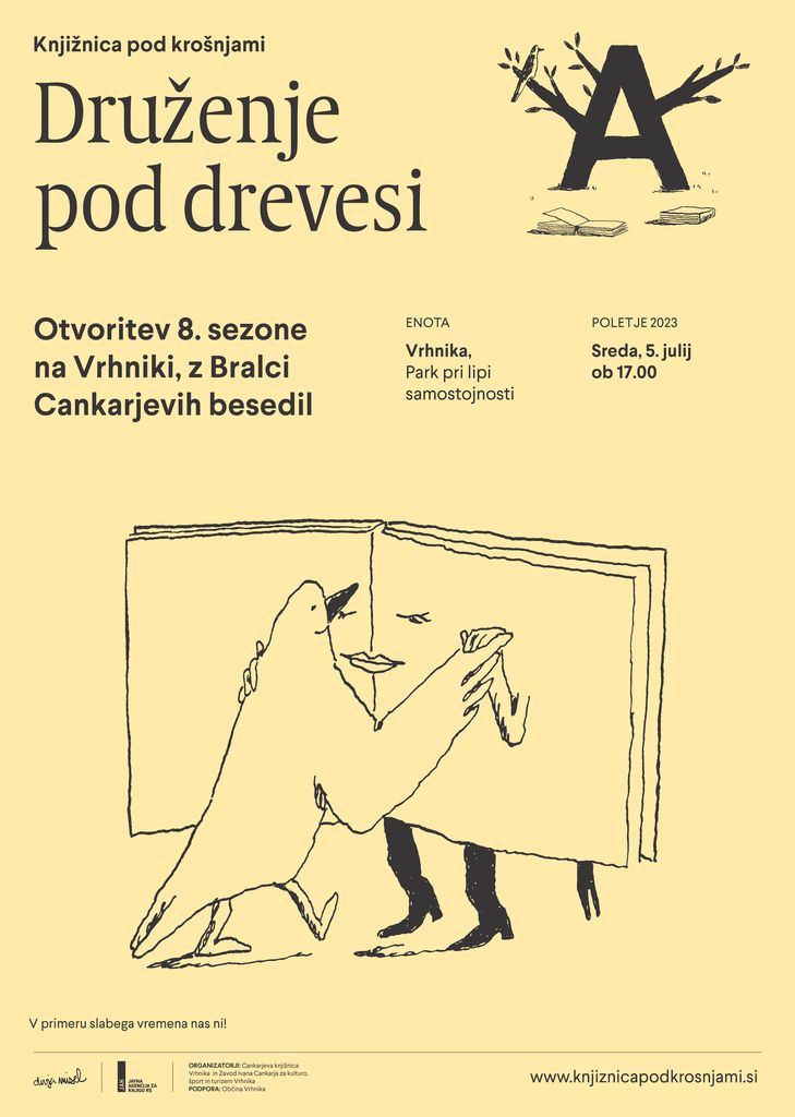 Tudi letos vas vabimo, da se nam v vročih poletnih dneh pridružite v hladni senci, ob pestrem izboru knjig. Odprtje 8. sezone Knjižnice pod krošnjami bo v sredo, 5. 7. 2023, ob 17.00. Pridružili se nam bodo Bralci Cankarjevih besedil. Vabljeni v Park pri lipi samostojnosti (pred TIC Vrhnika na Tržaški cesti 9).