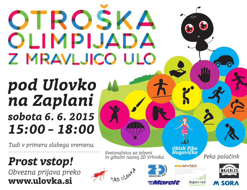 Mravljica Ula vabi vse otroke na otroško olimpijado pod Ulovko na zaplano (cca 30 km iz Ljubljane). Na dogodku se bodo otroci zabavali na več kot 15 športnih in zabavnih aktivnostih. Dogodek je brezplačen, obvezna prijava in več info na www.ulovka.si.