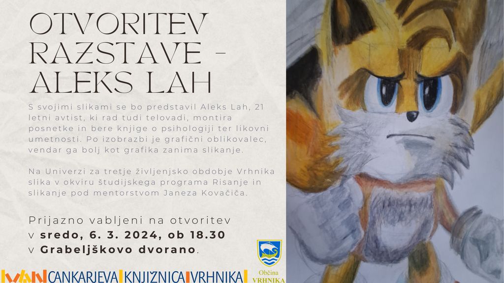 S svojimi slikami se bo predstavil Aleks Lah, 21 letni avtist, ki poleg risanja rad tudi telovadi, montira posnetke in bere knjige o psihologiji ter likovni umetnosti (likovna anatomija, likovna teorija). Po izobrazbi je grafični oblikovalec, vendar ga bolj kot grafika zanima slikanje. Na Univerzi za tretje življenjsko obdobje Vrhnika slika v okviru študijskega programa Risanje in slikanje pod mentorstvom Janeza Kovačiča. Prijazno vabljeni na otvoritev v sredo, 6. 3. 2024, ob 18.30 v Grabeljškovo dvorano.