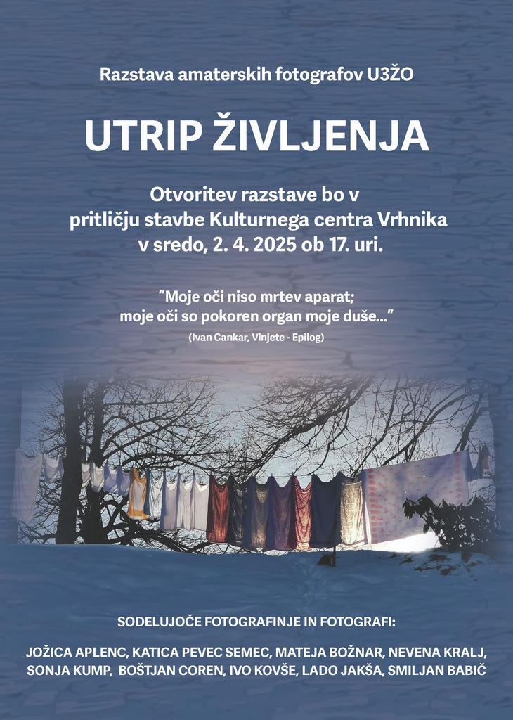 Vabljeni na otvoritev razstave, ki bo v pritličju Kulturnega centra v sredo, 2. 4. 2025, ob 17. uri. Sodelujoče fotografinje in fotografi: Jožica Aplenc, Katica Pevec Semec, Mateja Božnar, Nevena Kralj, Sonja Kump, Boštjan Coren, Ivo Kovše, Lado Jakša, Smiljan Babič.