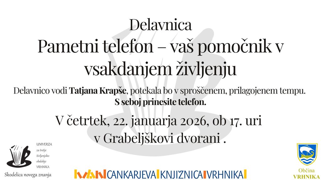 V okviru U3ŽO Vrhnika vabimo na praktično delavnico Pametni telefon – vaš pomočnik v vsakdanjem življenju, za dvig digitalne samozavesti, namenjeno starejšim, ki želijo bolje spoznati in samozavestno uporabljati pametni telefon. Spoznali boste osnovne funkcije pametnega telefona, varno rabo interneta ter uporabne trike za vsakdan. Delavnico vodi Tatjana Krapše, potekala bo v sproščenem, prilagojenem tempu. S seboj prinesite telefon.