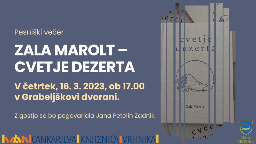 Vabimo vas, da se nam v četrtek, 16. 3. 2023, ob 17.00, pridružite na literarnem oziroma pesniškem večeru, ki ga bomo preživeli v družbi Zale Marolt in predstavitvi njene pesniške zbirke Cvetje dezerta. Zala Marolt je študentka Pravne fakultete v Ljubljani, ki se želi s svojo poezijo dotakniti predvsem mladostnikov. Njene pesmi se poglabljajo v tematike o odraščanju, sprejemanju sebe, o prvi ljubezni, raziskovanju telesa, spoprijemanju s tesnobo in paničnimi napadi ter obvladovanju teže medsebojnih odnosov. Pridružite se nam. Dogodek se bo odvijal v Grabeljškovi dvorani Cankarjeve knjižnice Vrhnika, z gostjo pa se bo pogovarjala Jana Petelin Zadnik.
