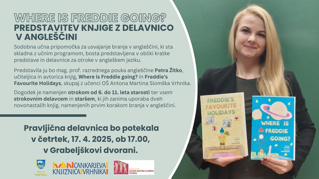 Sodobna učna pripomočka za usvajanje branja v angleščini, ki sta skladna z učnim programom, bosta predstavljena v obliki kratke predstave in delavnice za otroke v angleškem jeziku. Predstavila ju bo Petra Žitko, učiteljica in avtorica knjig, Where is Freddie going? in Freddie’s Favourite Holidays, skupaj z učenci OŠ Antona Martina Slomška Vrhnika. Petra Žitko je magistrica profesorica razrednega pouka angleščine, z več kot deset letnimi izkušnjami poučevanja angleščine v različnih starostnih obdobjih.