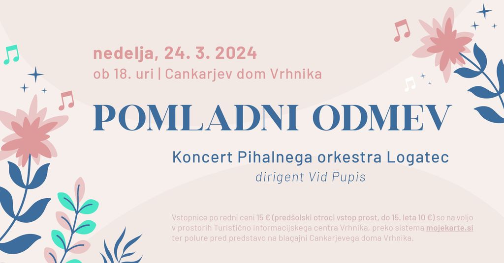 Pihalni orkester Logatec vas vabi, da se jim pridružite na dogodku, ki bo Cankrajev dom na Vrhniki napolnil s čudovito orkestrsko glasbo. Prihaja "Pomladni odmev" - večer, ki ga bodo zaznamovali izjemni solisti, združeni v harmoniji in strasti do glasbe. Prisluhnite izvrstnemu orkestru, ki spada v sam vrh amaterskih pihalnih orkestrov tako v Sloveniji kot tudi v tujini in si je v svoji bogati zgodovini priigral kar 16 priznanj in laskavih pohval na domačih in tujih tekmovanjih v najvišji koncertni kategoriji. Vabljeni torej na čudovit nedeljski dogodek, ki vas bo popeljal v svet vrhunske orkestrske glasbe.