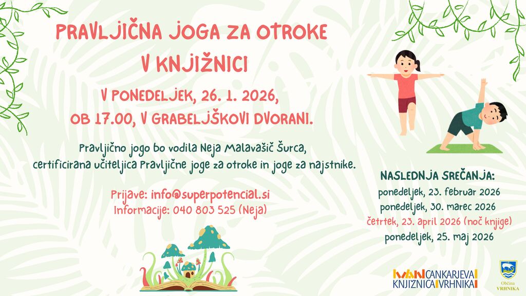 Pravljična joga je samostojna dejavnost za otroke in ni vezana na obiskovanje Pravljičnih uric. Srečanje bo v ponedeljek, 26. januarja 2026, ob 17.00 v Grabeljškovi dvorani. Naslednja srečanja bodo potekala 23. 2., 30. 3., 23. 4. in 25. 5. Pravljična joga za otroke je prijetna vadba, ki je prilagojena otrokovim sposobnostim. Pravljica, igra, gibanje, dinamika, vse to so elementi Pravljične joge za otroke. Skozi pravljico se bodo otroci spremenili v prave pravljične junake in tako spoznali nekaj osnovnih jogijskih položajev in preprostih dihalnih tehnik. S Pravljično jogo bodo krepili svojo moč, se povezali sami s seboj, se sprostili in napolnili z novo svežo energijo. Pravljično jogo vodi Neja Malavašič Šurca, certificirana učiteljica Pravljične joge za otroke in joge za najstnike. Prijave sprejema na mail: info@superpotencial.si.