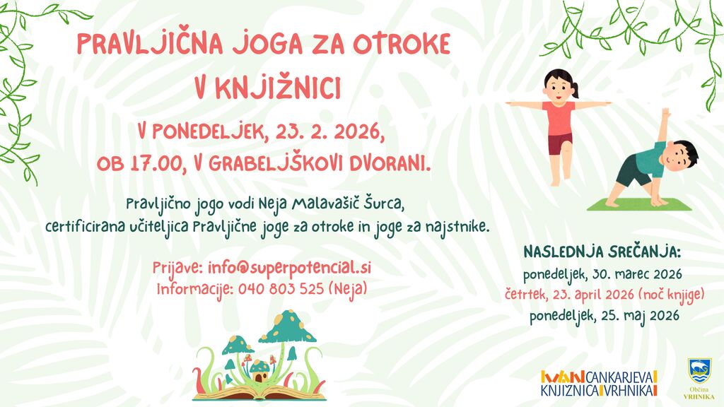 Pravljična joga je samostojna dejavnost za otroke in ni vezana na obiskovanje Pravljičnih uric. Srečanje bo v ponedeljek, 23. februarja 2026, ob 17.00v Grabeljškovi dvorani. Naslednja srečanja bodo potekala 30. 3., 23. 4. in 25. 5. Pravljična joga za otroke je prijetna vadba, ki je prilagojena otrokovim sposobnostim. Pravljica, igra, gibanje, dinamika, vse to so elementi Pravljične joge za otroke. Skozi pravljico se bodo otroci spremenili v prave pravljične junake in tako spoznali nekaj osnovnih jogijskih položajev in preprostih dihalnih tehnik. S Pravljično jogo bodo krepili svojo moč, se povezali sami s seboj, se sprostili in napolnili z novo svežo energijo. Pravljično jogo vodi Neja Malavašič Šurca, certificirana učiteljica Pravljične joge za otroke in joge za najstnike. Prijave sprejema na mail: info@superpotencial.si.