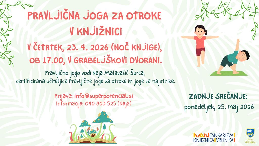 Pravljična joga je samostojna dejavnost za otroke in ni vezana na obiskovanje Pravljičnih uric. Srečanje bo v četrtek, 23. aprila 2026, ob 17.00v Grabeljškovi dvorani. Zadnje srečanje bo 25. 5. Pravljična joga za otroke je prijetna vadba, ki je prilagojena otrokovim sposobnostim. Pravljica, igra, gibanje, dinamika, vse to so elementi Pravljične joge za otroke. Skozi pravljico se bodo otroci spremenili v prave pravljične junake in tako spoznali nekaj osnovnih jogijskih položajev in preprostih dihalnih tehnik. S Pravljično jogo bodo krepili svojo moč, se povezali sami s seboj, se sprostili in napolnili z novo svežo energijo.