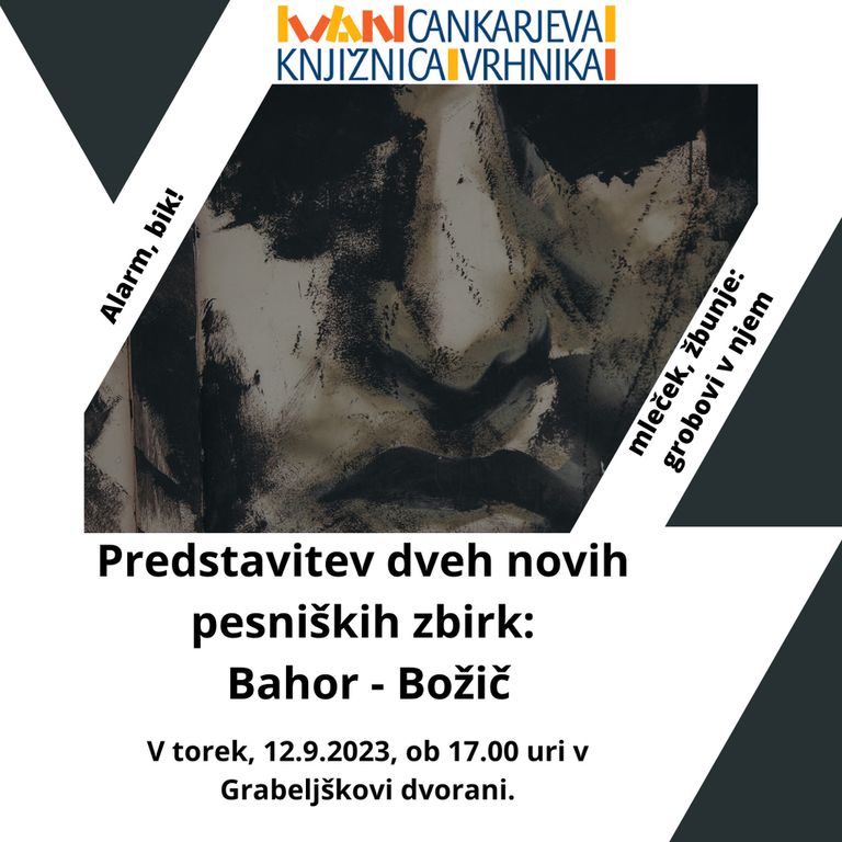 Vabljeni na predstavitev dveh novih pesniških zbirk zelo zanimivih avtorjev: Nejc Bahor - Alarm, Bik! in Blaž Božič – »mleček, žbunje: grobovi v njem«. Literarni večer bo potekal v torek, 12. 9. 2023, ob 17.00 v Grabeljškovi dvorani. Z avtorjema se bo pogovarjala Jana Petelin Zadnik.