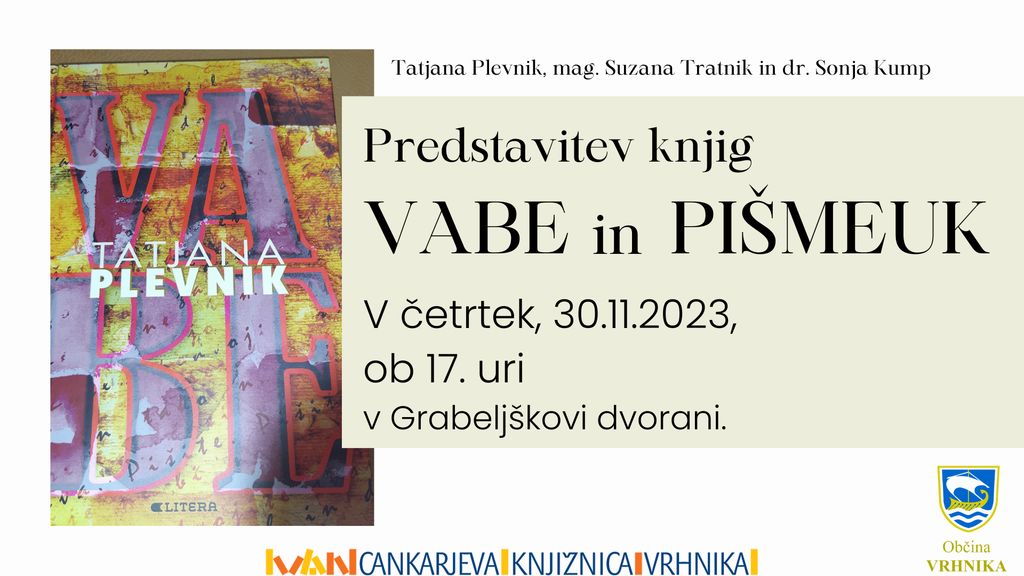 Literarni pogovor z avtorico o obeh knjigah bo vodila mag. Suzana Tratnik, urednica Pišmeuka. Prijazno vabljeni v Grabeljškovo dvorano, v četrtek, 30. 11. 2023, ob 17.00. V sodelovanju z dr. Sonjo Kump.