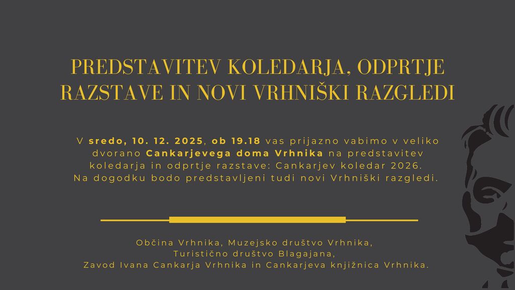 V sredo, 10. 12. 2025, ob 19.18 vas prijazno vabimo v avlo in v veliko dvorano Cankarjevega doma Vrhnika na predstavitev koledarja in odprtje razstave: Cankarjev koledar 2026. Na dogodku bodo predstavljeni tudi novi Vrhniški razgledi. Prijazno vas vabimo Občina Vrhnika, Muzejsko društvo Vrhnika, Turistično društvo Blagajana, Zavod Ivana Cankarja Vrhnika in Cankarjeva knjižnica Vrhnika. Povsod je luč.