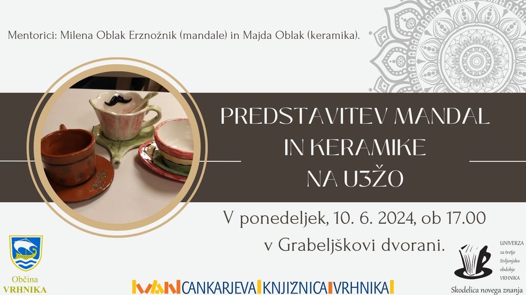 Prijazno vabljeni na predstavitev mandal in izdelkov iz keramike, ki nastajajo v okviru Univerze za tretje življenjsko obdobje Vrhnika. Mentorica v študijskem programu Likovno ustvarjanje Mandale je Milena Oblak Erznožnik, mentorica keramike pa je Majda Oblak. V glasbenem delu bo nastopila Žana Erznožnik. V ponedeljek, 10. 6. 2024, ob 17.00 v Grabeljškovi dvorani.