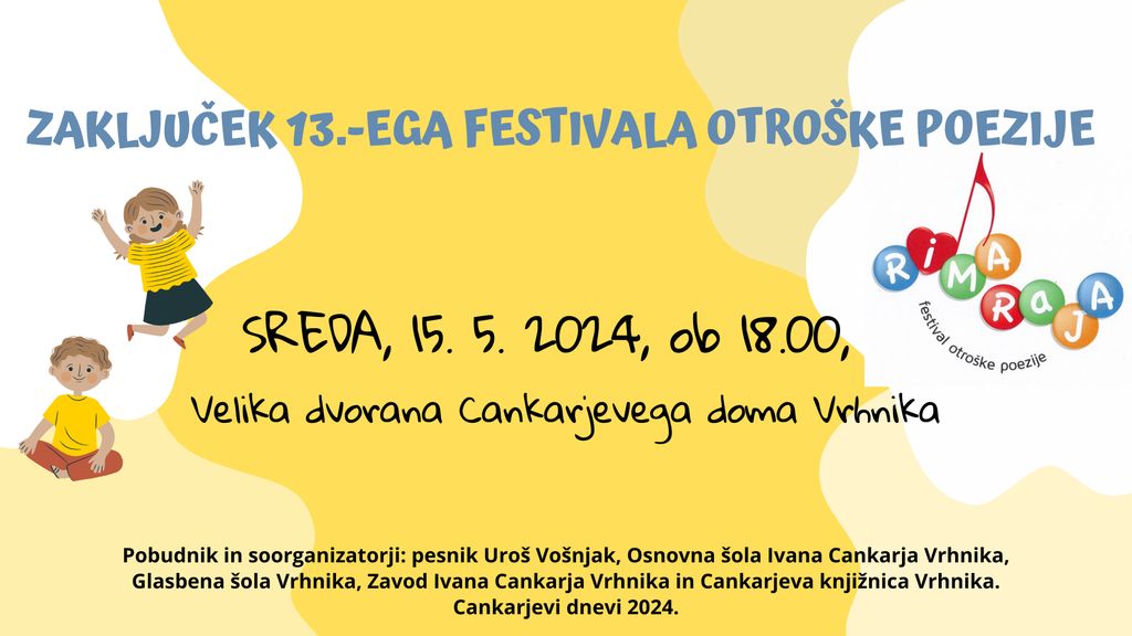 Prijazno vabljeni na zaključek 13. festivala otroške poezije Rima raja, ki bo v Veliki dvorani Cankarjevega doma Vrhnika, v sredo, 15. 5. 2024, ob 18.00. Pobudnik in soorganizatorji: pesnik Uroš Vošnjak, Osnovna šola Ivana Cankarja Vrhnika, Glasbena šola Vrhnika, Zavod Ivana Cankarja Vrhnika in Cankarjeva knjižnica Vrhnika. Cankarjevi dnevi 2024.