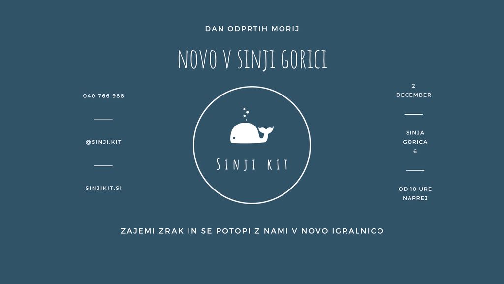 V soboto, 2.12.2023, se odpirajo vrata igralnice SINJI KIT! Prisrčno vabljeni na nepozabno pustolovščino v svetu Sinjega kita. Izkusite igro, ustvarjalnost, in okusna presenečenja, ki jih bo pripravil Masterchef Luka Novak! SINJI KIT je prostor za rojstnodnevna praznovanja in sproščeno druženje. Obiščite nas in doživite čarobnost globin morja!☺️Več informacij na SINJIKIT.SI