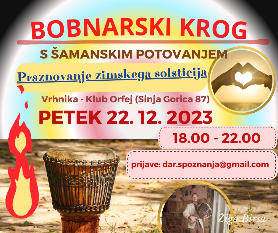 Vabimo vas, da se nam v petek 22. 12. 2023 ob 18.00 (do 22.00) na Vrhniki v Klubu Orfej (Sinja Gorica 87) pridružite na Bobnarskem krogu s šamanskim potovanjem in Z NAMI PRAZNUJETE zimski solsticij, ki je pravzaprav naraven vstop v novo leto.