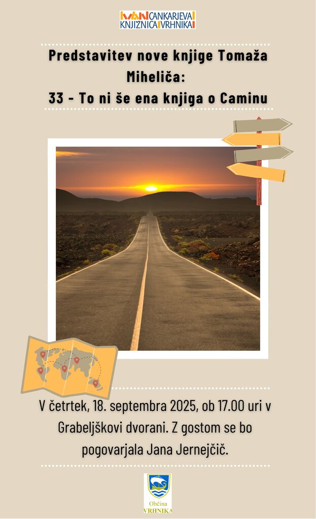 Vabljeni na predstavitev nove knjige Tomaža Miheliča: 33 - To ni še ena knjiga o Caminu. V četrtek, 18. 9. 2025, ob 17.00 v Grabeljškovi dvorani. Z gostom se bo pogovarjala Jana Jernejčič. Kot so zapisali na portalu dobreknjige.si »Ker življenje vendarle ni samo ena gladka ravna cesta, temveč je pogosto prepredena z vzpetinami, ovinki in kotanjami, si marsikdo zaželi malce oddiha, kjer bi lahko odmislil vse svoje težave, se sprostil in ponovno našel bistvo svojega življenja. In prav Camino pot nam lahko ponudi takšen izhod v sili. To je lahko pot, kjer srečamo samega sebe in kot opisuje avtor, pot, kjer lahko srečamo dobre prijatelje.« Prijazno vabljeni.
