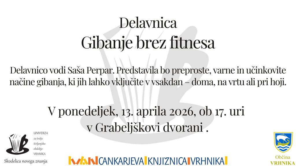 Kako ostati telesno dejaven, močan in gibljiv tudi v zrelih letih brez fitnesa? Na delavnici U3ŽO Vrhnika bomo predstavili preproste, varne in učinkovite načine gibanja, ki jih lahko vključite v vsakdan – doma, na vrtu ali pri hoji. Namenjena je predvsem starejšim, zlasti moškim, ki želijo ohraniti moč, ravnotežje in samostojnost ter zmanjšati tveganje za padce in bolečine. Delavnico bo vodila Saša Perpar, strokovna delavka na področju športa. Dobimo se v ponedeljek, 13. 4. 2026, ob 17.00 v Grabeljškovi dvorani. Prijava ni potrebna. Moderatorica delavnice je dr. Katica Pevec Semec.