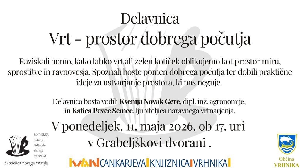 Vabljeni na delavnico, kjer bomo raziskali, kako lahko vrt ali zelen kotiček oblikujemo kot prostor miru, sprostitve in ravnovesja. Spoznali boste pomen dobrega počutja ter dobili praktične ideje za ustvarjanje prostora, ki nas neguje. S seboj lahko prinesete fotografijo svojega vrta ali prostora, ki ga želite preoblikovati. Delavnica bo v ponedeljek, 11. 5. 2026, ob 17. uri v Grabeljškovi dvorani. Prijava ni potrebna. Delavnico bosta vodili Ksenija Novak Gere, dipl. inž. agronomije, in Katica Pevec Semec, ljubiteljica naravnega vrtnarjenja. Moderatorica delavnice je dr. Katica Pevec Semec (U3ŽO).