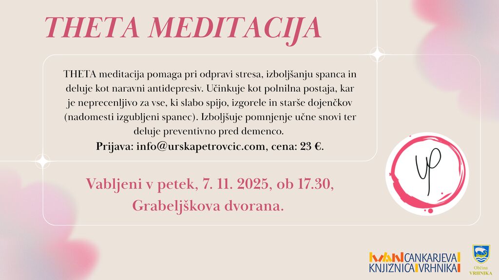 THETA meditacija pomaga pri odpravi stresa, izboljšanju spanca in deluje kot naravni antidepresiv. Učinkuje kot polnilna postaja, kar je neprecenljivo za vse, ki slabo spijo, izgorele in starše dojenčkov (nadomesti izgubljen spanec). Izboljšuje pomnjenje učne snovi ter deluje preventivno pred demenco. Prijava: info@urskapetrovcic.com, cena: 23 €. Vabljeni v petek, 7. 11. 2025, ob 17.30, Grabeljškova dvorana.