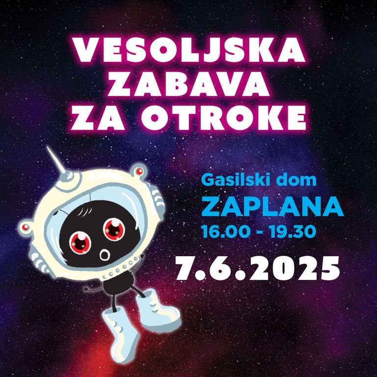 Vesoljska zabava za otroke na Zaplani Zabava v vesoljskem duhu! Kaj vse čaka na otroke? Interaktivne delavnice in raziskovanje vesolja Vsak otrok, ki bo obiskal vseh 8 delavnic, bo imel priložnost sodelovati v nagradnem žrebanju za bogate nagrade. Ogled planetarija – potovanje skozi vesolje Gledališka predstava: Tinček Zaplaninček in vesoljčki Gasilska veselica za vse generacije Zahvala sponzorjem Vabljeni vsi – ne zamudite priložnosti, da z otroki preživite nepozaben dan na Zaplani!