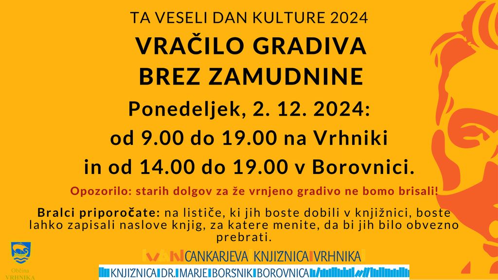 VRAČILO GRADIVA BREZ ZAMUDNINE V CANKARJEVI KNJIŽNICI VRHNIKA: če imate doma gradivo, ki mu je potekel rok izposoje, ga lahko na izbrani dan vrnete s širokim nasmehom, saj ne boste plačali niti zamudnine niti stroška opominov. Letos vljudno vabljeni v ponedeljek, 2. 12. 2024, od 9.00 do 19.00 na Vrhniko in od 14.00 do 19.00 v Borovnico. Opozorilo: starih dolgov za že vrnjeno gradivo ne bomo brisali.
