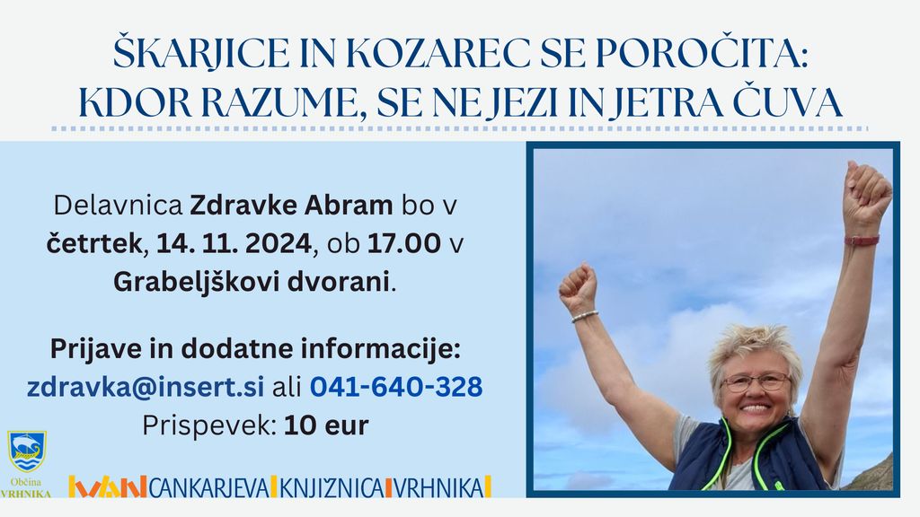 »Ali sploh imata možnosti za složno sobivanje? Bodo škarjice razumele, da kozarec ne zmore zrezati niti tankega papirja? Kaj pa kozarec, bo razumel, da v škarjice ne more naliti niti deciliter vode ali vina?« Delavnica Zdravke Abram je namenjena vsem, ki želijo prepoznati svoje ravnanje iz vidika lastne prepoznave osebnosti in posledično razumeti, da imajo tudi drugi ljudje svojo »mehko« sestavo osebnosti, ki je še ne prepoznajo in je zato niti ne morejo spremeniti. Ugotovimo tudi, da imamo nekateri več možnosti delati osebne spremembe, ker nosimo v sebi to sposobnost, ki je tudi nam ljube osebe morda nimajo. Ko to spoznamo, je lažje odpuščati in odmeriti napake, sploh, ko gre za razmerja do otrok – do staršev – do partnerjev … Vabljeni v četrtek, 14. 11. 2024 ob 17.00 v Grabeljškovo dvorano. Prijave oziroma dodatne informacije zdravka@insert.si ali 041 640 328. Prispevek za delavnico je 10 eur.