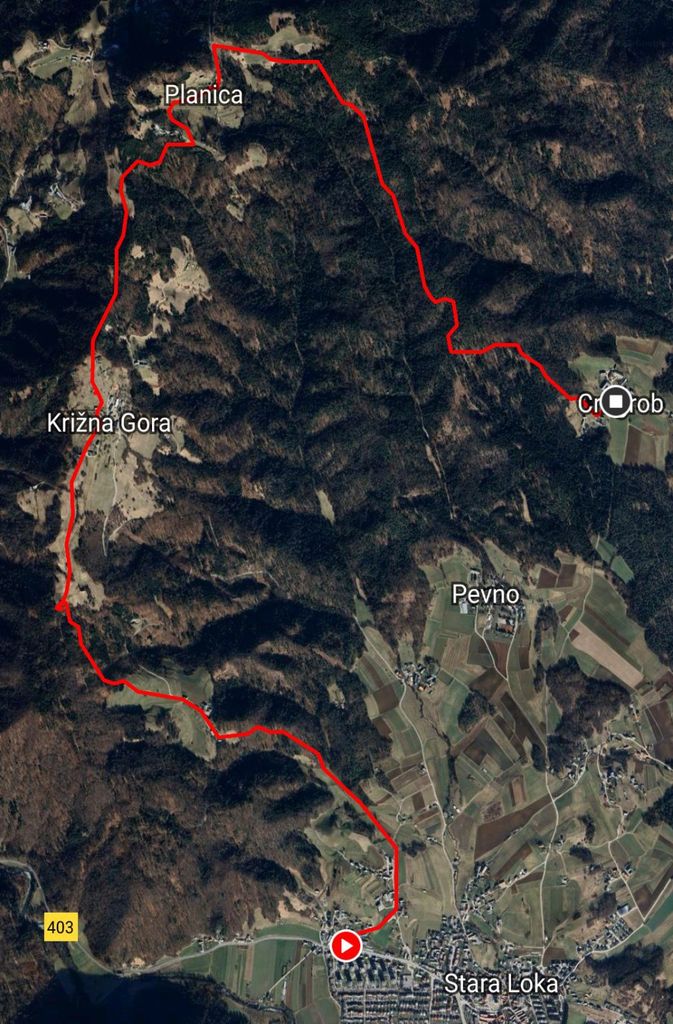 Pot smo začeli v Škofji Loki, ki leži na nadmorski višini 351 metrov, ob sotočju Poljanske in Selške Sore ter se vzpeli do vasi Križna Gora. Južno od naselja, na slemenu, stoji cerkev sv. Križa. Pot smo nadaljevali proti Planici in po poti občudovali pokrajino, ki nas je spominjala na film Cvetje v jeseni.