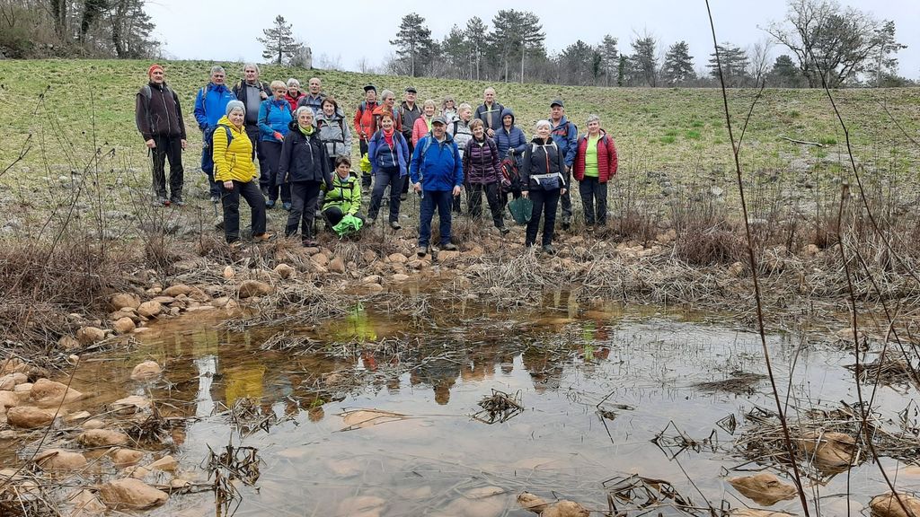 Po zanimivi tematski poti v okolici Kobjeglave nas je 22. 2. 2024 vodil vodnik Frenk Petrič. Kljub temu, da smo se po Poti 9. kalov Barjani podali že drugič, se nas je zbralo 27. Kali oz. vodni viri so bili včasih namenjeni napajanju živine med pašo na kraški gmajni in so bili za kraškega človeka neprecenljive vrednosti. V okolici Kobjeglave se jih nahaja kar 9 in vsi so obnovljeni. Čeprav nas je polovico poti spremljal rahel dež, smo si Barjani ogledali prav vse.