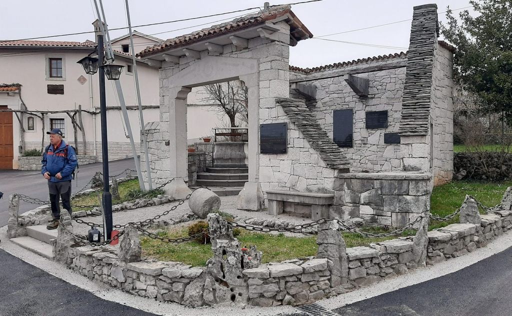 Današnji pohod smo pričeli v Kobjeglavi pri spomeniku NOB. Spomenik je ograjen z nizkim kamnitim zidom in predstavlja kraško hišo, z značilnim kamnitim vhodnim portalom in kraškim vodnjakom. Pokončni kamni okoli spomenika, povezani z verigo, simbolizirajo v vojni padle vaščane.