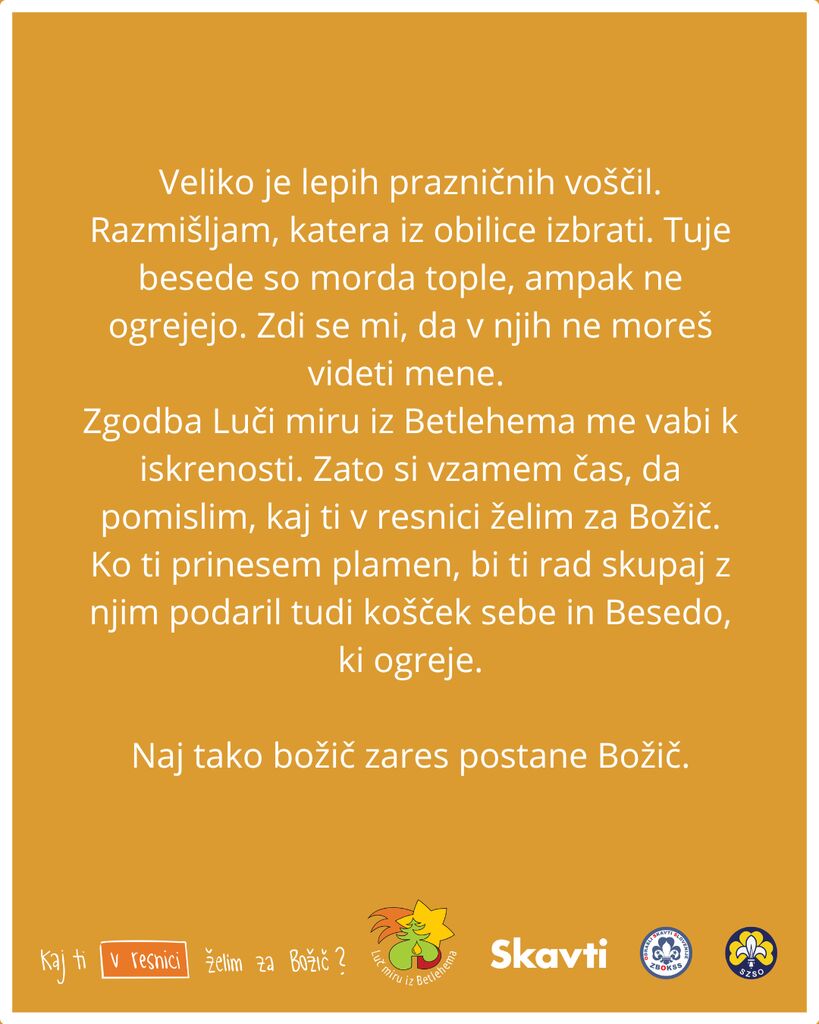 Letos skavti prinašamo Luč miru iz Betlehema pod geslom Kaj ti v resnici želim za Božič?. Luč miru nas spodbuja, da se ustavimo sredi prazničnega vrveža in ponovno odkrijemo bistvo božičnega časa. Pri pisanju božičnih voščil si vzemimo čas za razmislek o človeku, ki mu je voščilo namenjeno - da pomislimo, kaj mu v resnici želimo. Ena najpomembnejših stvari, ki jih lahko naredimo za svojega bližnjega, je prav to, da naša voščila zares pridejo iz srca.