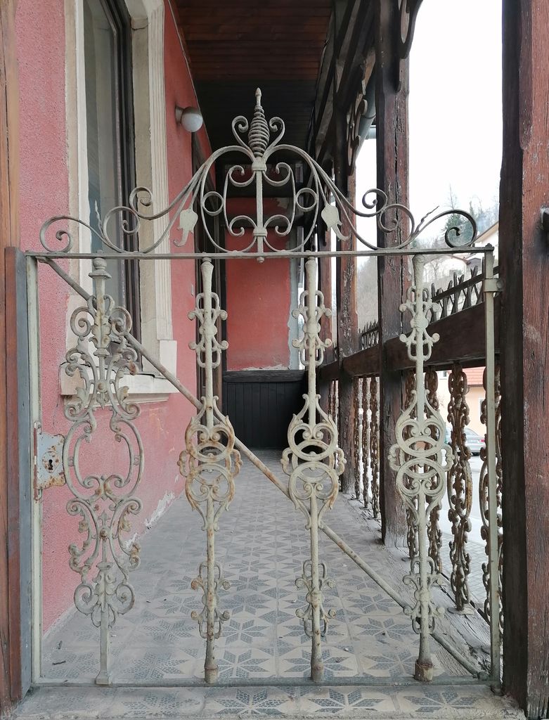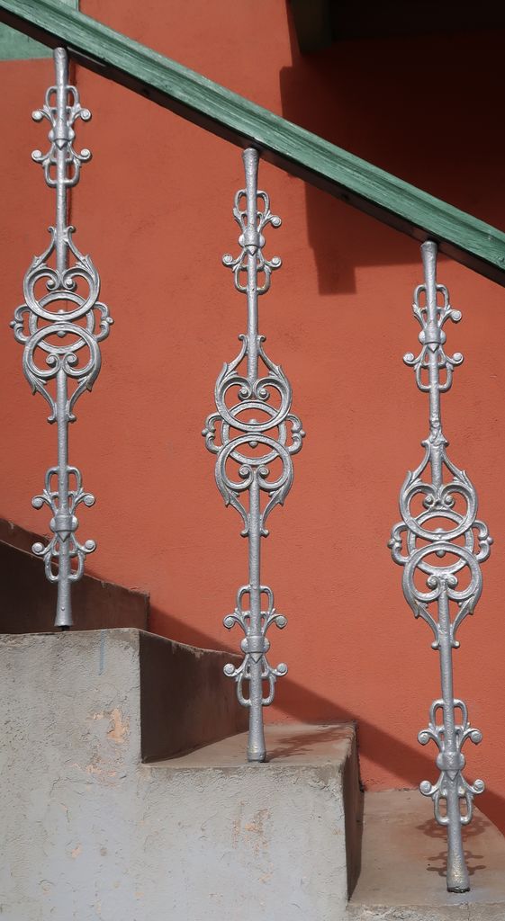 Dostop v nadstropje vodi po stopnicah z ograjo iz litoželeznih balustrov in lesenim držalom. Vsak baluster je sestavljen iz dveh palic, na sredini povezanih s krogom z viticami. Kot lahko vidimo v katalogu, ki ga je natisnila (litografska) tiskarna Wurm & Schlögl, gre za izdelek dunajske livarne Rudolfa Philippa Waagnerja (tabela 15, št. balustra 42).[3] Enake balustre lahko vidimo tudi pri vhodnih vratih zapuščene in propadajoče hiše Kvedrova 1 v Sevnici (tisti na verandi so drugačni).