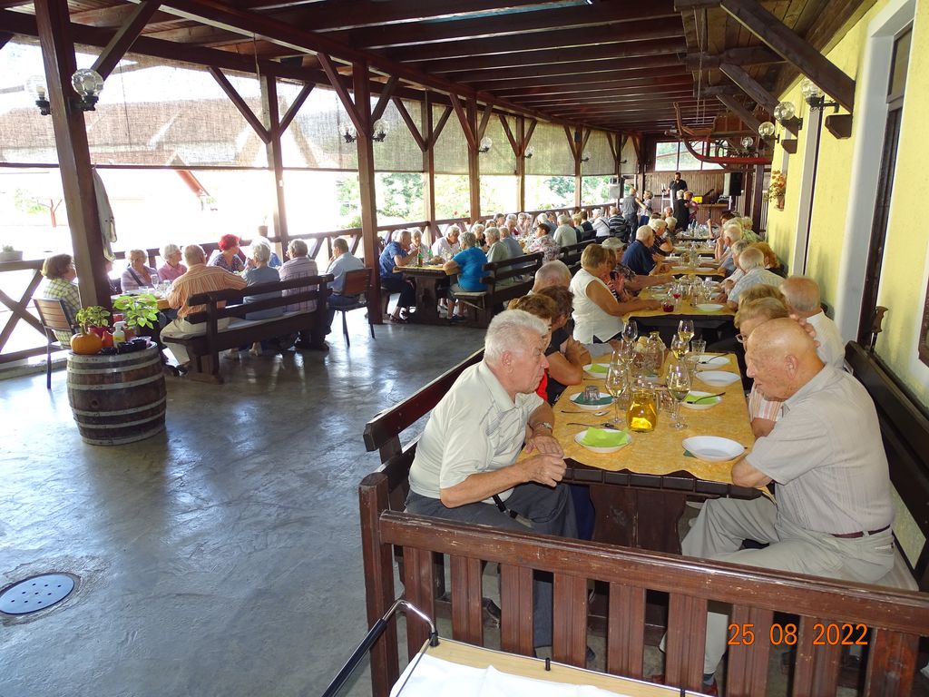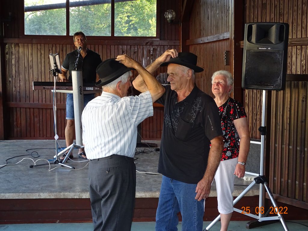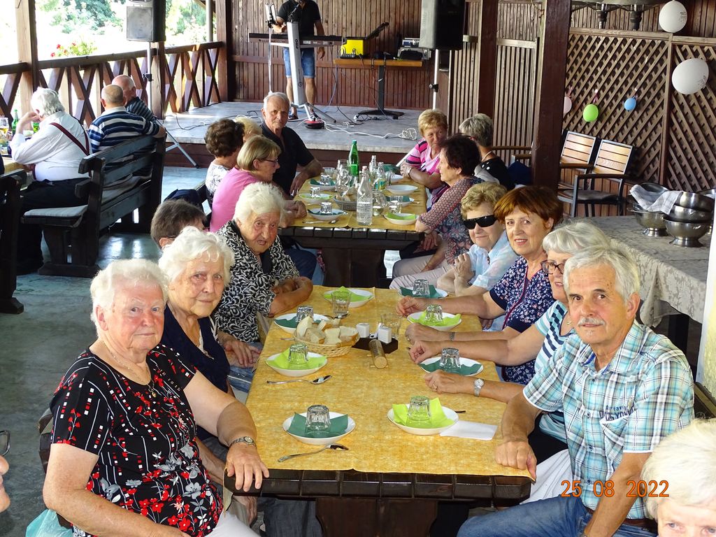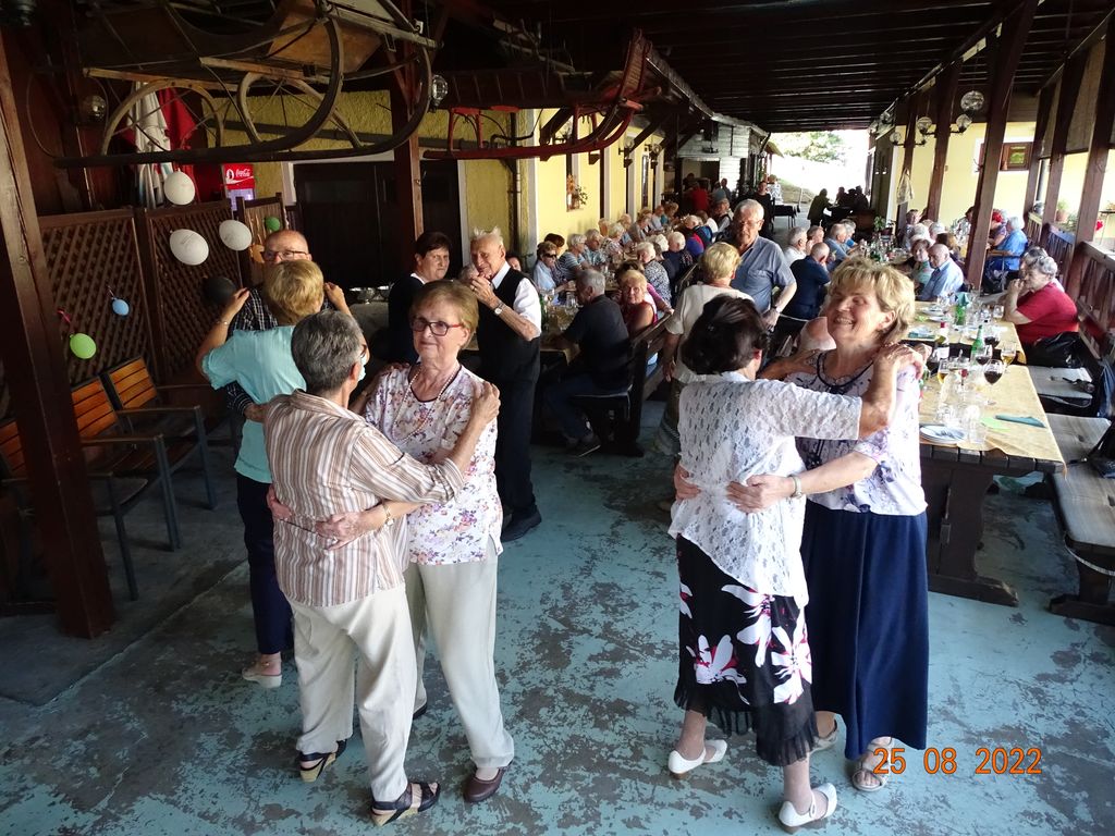 Četrtek je na DU Vrhnika rezerviran za izlete, družabna srečanja in kulturne dogodke. Ker pa smo bili kar dve leti bolj ali manj prikrajšani za druženja zaradi covida, so članice in člani komaj čakali, da se družijo. Zato so bili dobro obiskani izleti in pohodi po koncu prepovedi. Še posebno pa smo bili veseli, da bomo letos lahko pripravili druženje starejših od 75 let. Pričakovali smo veliko udeležbo, a bili smo prijetno presenečeni in vzradoščeni, ker so bila pričakovanja presežena. Že v koledarčku, ki ga dobi vsaka članica in član, ki plača članarino, je označen datum v avgustu kot dan za srečanje. Konec julija pa smo po vseh oglasnih deskah po KS še posebej povabili naše starejše na srečanje. Članice in člani socialne komisije in prostovoljke iz Projekta starejši za starejše so se dogovarjali, kje in kako naj poteka srečanje po dveh suhih letih in na obiskih seznanjali člane s prireditvijo.Tako smo imeli dan pred srečanjem prijavljenih kar 87 članic in članov. Tudi zato smo se odločili, da povabimo medse podžupana, gospoda Jožeta Malovrha, ki se nam je z veseljem pridružil. Prijazno je pozdravil navzoče in v kratkem govoru pohvalil delovanje društva na mnogih področjih. Po dobrem kosilu so udeleženci prisluhnili glasbi ali pa se predali živahnemu klepetu in obujanju spominov. Vmes smo na pobudo prostovoljk s šopkom, kot drobno pozornost in v zahvalo presenetili Amalijo Ogrin in Toneta Kogovška. Oba sta bila ganjena in sta nas spraševala, zakaj sta si zaslužila tako pozornost. Gospod podžupan se je zadržal kar nekaj časa med člani in z njimi sproščeno kramljal. Mnogi pa kljub devetdesetim letom še niso pozabili plesati. Ob umirjenih valčkih so se prijetno vrteli.Tone je s šopkom v roki spraševal: »Pa kdo se je spomnil name, zelo sem vesel in ganjen..« »Saj že desetletja igraš na harmoniki vsem jubilantom, skrbiš za dobro voljo, poješ v pevskem zboru, spremljaš pevce… itd…« mu je razložila Vesna.Tudi Malči Osredkar iz Male Ligojne je bila srečna, s solznimi očmi se je zahvaljevala za pozornost, ki ji je bila namenjena. Da so se pari malo spočili, smo predstavili igro s klobuki in povabili prostovoljce k tekmovanju. Kar štirje gospodje in štiri dame so bili pripravljeni tekmovati. Smeha in navijanja je bilo veliko. Za pogum so prejeli skromne nagrade. Okoli 19. ure so se začeli odpravljati domov in se vsi po vrsti prostovoljkam zahvaljevali za lepo popoldne in dobro pozno kosilo.Tudi prostovoljke so bile zadovoljne in nagrajene za trud in dobro voljo, ki jo širijo med starejšimi. Kdor je želel, pa je lahko vzel tudi obsežen zbornik, ki smo ga izdali ob 70 letnici društva. Na voljo jih je bilo cca 50, a ni niti eden ostal.