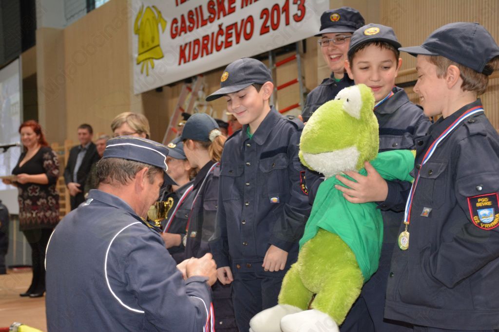 Uvrstitev na državnem tekmovanju ni nikomur podarjena, prav vsak si jo mora trdo prigarati. Pred tem je vse ekipe iz Gasilske zveze Vrhnika in Logatec, čakalo občinsko in regijsko tekmovanje, ki sta sočasno potekala v Osnovni šoli 8 talcev, Logatec. Na občinsko tekmovanje se je naše društvo odpravilo s petimi ekipami. Na dopoldanskem občinskem kvizu so se vse ekipe odlično odrezale. Prav vsak tekmovalec iz našega društva je prejel svojo medaljo. Pravila tekmovanja pa so določila, da se na regijsko popoldansko tekmovanje uvrstijo samo prvi dve ekipi iz posamezne kategorije, zato je ena ekipa odšla domov, ostali pa so morali svoje znanje pokazali še na popoldanskem regijskem tekmovanju. Ekipe so osvojile 7., 6., 4. in2. mesto. Drugo uvrščena ekipa, si je prislužila nastop na državnem tekmovanju. Sledile so vaje, učenje in preverjanja znanja. Štirinajst dni smo prav vse popoldneve preživeli v gasilskem domu. Vse prehitro se nam je približevala sobota, 23. 11. 2013 inz njo čas, da se odpravimo proti Kidričevem. Na pot smo se odpravili že zgodaj zjutraj, ker smo morali prevoziti kar dober del prelepe Slovenije. V zraku je bilo čutiti nekaj nervoze in treme pred tekmovanjem. Pomirili so nas trojanski krofi in nam vlili moči za tekmovanje. Ob prijavi na tekmovanje nam je bila dodeljena štartna številka 19. Na uvodni slovesnosti pa je nasmeh na lica privabila melodija pesmi Na Golici v izvedbi tamkajšnega pihalnega orkestra. Tekmovanje smo pričeli s teoretičnimi testi, pokazali svoje znanje v gasilski abecedi za konec pa smo se spopadli še s praktičnimi vajami. Fantje so vse vaje opravili brez kazenskih točk, prav tako pa so imeli tudi dober občutek o opravljenih teoretičnih znanjih. Med nestrpnim čakanjem na razglasitev rezultatov smo si ogledali različne spremljevalne dejavnosti, ki so nam bile na voljo. Napočil je težko pričakovani čas zaključne slovesnosti. Sledil je postroj tekmovalnih enot, zaključne spodbudne besede in seveda razglasitev rezultatov. Razglasitev se je pričela za kategorijo pionirjev, v kateri je tekmovalo triintrideset najboljših ekip iz vse Slovenije. Pri poslušanju rezultatov smo prišli že do polovice, našega društva pa še vedno niso poklicali. Sledila je razglasitev rezultatov za najboljših deset ekip. Vse do prvih treh mest o Bevkah ni bilo nič slišati. Kaj kmalu pa smo se zavedali, da smo edina ekipa, ki glasno proslavlja svoj uspeh in čaka, da se povzpne na najvišjo stopničko. Zaslišali smo: »Prvo mesto pripada pionirjem iz Prostovoljnega gasilskega društva Bevke.« Ekipa je poskakovala od veselja in zmedeno odhitela zasesti prvo stopničko, ki je bila tokrat rezervirana samo za prvake. Fantje so našo maskoto - ŽABO in pokal vzdignili visoko v zrak, ter s tem pokazali svoj ponos do prigaranega mesta. Sledila je razglasitev rezultatov še za ostale kategorije in zaključek tekmovanja. Polni vznemirjenja, veselja in ponosa smo se odpeljali proti domači vasi. Ves čas je v našem kombiju odmevala vesela glasba, popevanje in smeh. Prihod v domačo vas smo naznanili s sirenami in utripajočimi modrimi lučmi. Celi vasi smo želeli sporočiti, da so se v Bevke pripeljali DRŽAVNI PRVAKI!! Tega pa so se zelo dobro zavedali tudi vsi naši člani, saj so nas presenetili s čudovitim sprejemom. Ob prihodu pred domači gasilski dom, so nas pozdravili številni gasilski curki, zvok harmonike in bučen aplavz vseh staršev, ostalih otrok, članov, članic in veteranov našega društva. Junaki so s pokalom v roki poskakali iz kombija. Nato pa so sledile številne čestitke, objemi, solze sreče in nazdravljanje z največjim pokalom, kar jih do sedaj premore naše društvo. Pozno v noč se je nadaljevalo veselo druženje s prvaki in celotnim društvom.