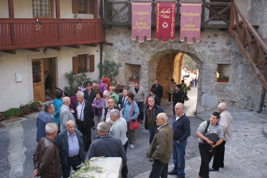 Na turistični kmetiji nas je pričakalo okusno kosilo, ki smo ga dopolnili s kobjeglavskim teranom. Pot nas je dalje vodila v srednjeveško mestece Štanjel, ki vedno znova preseneti s svojimi kamnitimi znamenitostmi. Vendar življenje sodobnega človeka v takšnem okolju ni enostavno, kar nam je nazorno predstavil tamkajšnji čebelar g.Švagelj. Pred njegovo hišo nas je pritegnil »medomat« samopostrežna omarica medenih dobrot, iz katere si kupec vzame izbran artikel in ga »pošteno« plača v prazen kozarec – v katerem pa je izkupiček na presenečenje vseh vedno pozitiven.