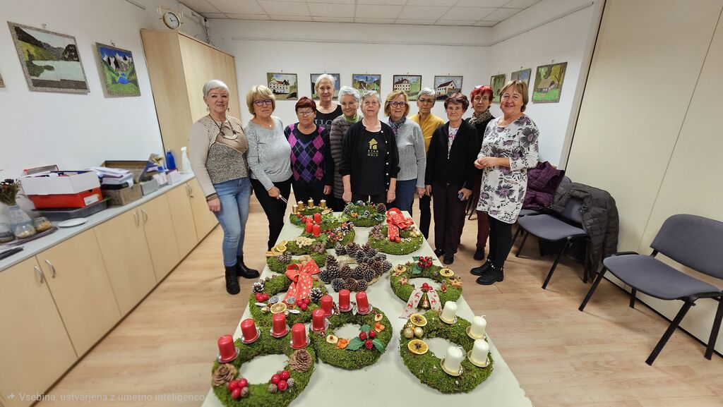 Na delavnici izdelovanja adventnih venčkov se nas je zbralo kar lepo število. Naši mentorici, Irena Rossi in Cvetka Resnik, sta nas naučili izdelati obod venčka, oblečen s suhim mahom in pritrjen s tanko barvasto kovinsko žico. Sledila je krasitev venčka, vsaka po svoji presoji, z barvitimi ali naravnimi elementi. Prepletale so se žive barve: rdeča, zlata, srebrna, zelenje in ne sme manjkati kakšen storž. Jana Malavašič se je potrudila in je z našega primorja prinesla rožmarin, storže in razne posušene sadeže. Nada Kostanjevec je na Medvedjem Brdu nabrala šiške, orehe, šipek in želode. Nastale so prave mojstrovine.
