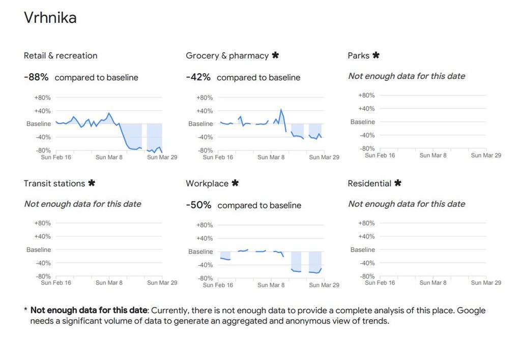 Ameriški internetni gigant Google je objavil poročilo o gibanju uporabnikov za 131 držav, kjer so razvidni trendi povečanega ali zmanjšanega obiska javnih ali zasebnih površin. "Upamo, da bodo ta poročila pomagala pri odločitvah o upravljanju pandemije covid-19," so zapisali v Googlovem zdravstvenem oddelku. Sistem meri podobno kot se spremljajo prometni zamaški, hkrati naj bi bila zagotovljena tudi anonimnost nosilcev podatkov. Izsledki sprememb gibanja so na voljo tudi za Vrhniko med 16. februarjem in 29. marcem. Ker gre za manjše mesto, baza podatkov ne zadošča za vse prikaze, so zapisali na Googlu, kljub temu pa so podali tri primerjalne grafe. Kar 88% manj je obiska gostinskih obratov, parkov, muzejev, knjižnic, kina... Trgovine beležijo 42% manj obiska, 50% je manj migracij na delo.