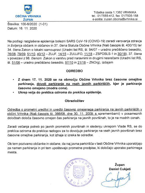 Z jutrišnjem dnem stopi v veljavo odredba župana, ki dovoljuje parkiranje na modrih conah brez časovne omejitve. Ukrep velja do preklica oziroma do preklica epidemije. Na občini ob tem pozivajo občanke in občane, da omenjena parkirišča uporabljajo za namen parkiranja in pri tem upoštevajo prometne predpise s področja uporabe parkirnih mest.