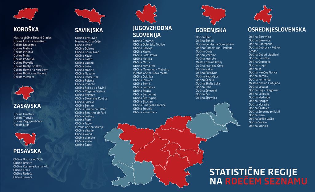 Za rdeče regije, kjer število na novo okuženih v zadnjih 14 dnevih presega 140 na 100.000 prebivalcev, bodo od petka veljali naslednji ukrepi:
