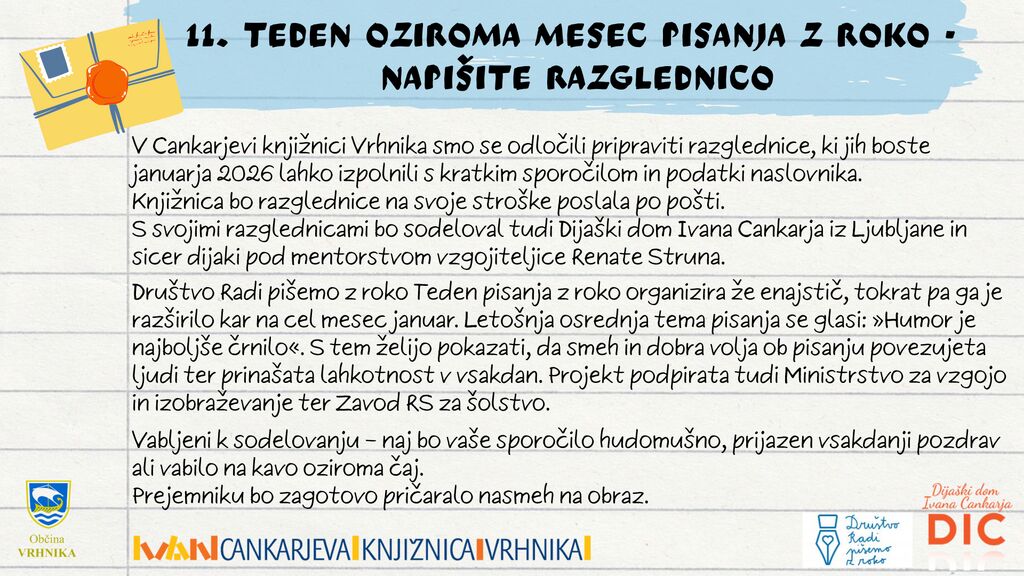 V Cankarjevi knjižnici Vrhnika smo se odločili pripraviti razglednice, ki jih boste januarja 2026 lahko izpolnili s kratkim sporočilom in podatki naslovnika, kateremu želite poslati razglednico. Pri projektu bo s svojimi razglednicami sodeloval tudi Dijaški dom Ivana Cankarja iz Ljubljane, in sicer dijaki pod mentorstvom vzgojiteljice Renate Struna. Knjižnica bo razglednice na svoje stroške poslala po pošti. Društvo Radi pišemo z roko Teden pisanja z roko organizira že enajstič, tokrat pa ga je razširilo kar na cel mesec januar. Letošnja osrednja tema pisanja se glasi: »Humor je najboljše črnilo«. S tem želijo pokazati, da smeh in dobra volja ob pisanju povezujeta ljudi ter prinašata lahkotnost v vsakdan. Projekt podpirata tudi Ministrstvo za vzgojo in izobraževanje ter Zavod RS za šolstvo. Vabljeni k sodelovanju – naj bo vaše sporočilo hudomušno, prijazen vsakdanji pozdrav ali vabilo na kavo oziroma čaj. Prejemniku bo zagotovo pričaralo nasmeh na obraz.