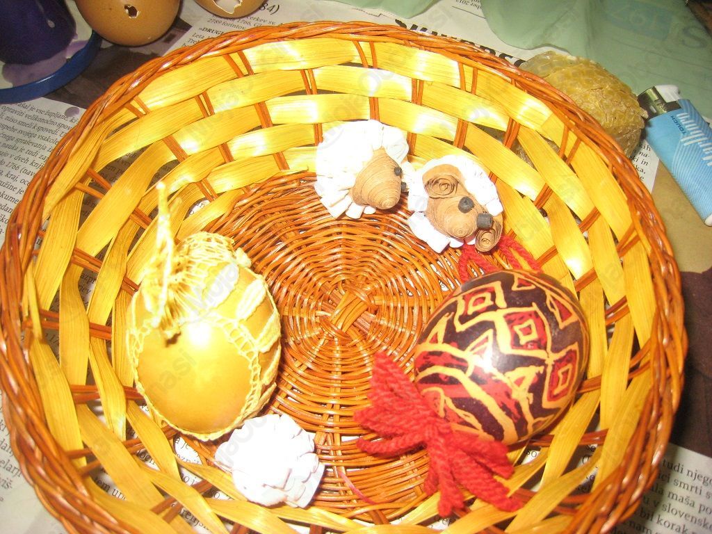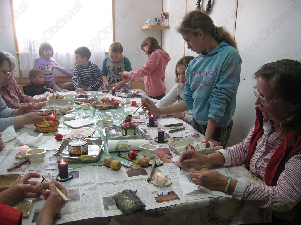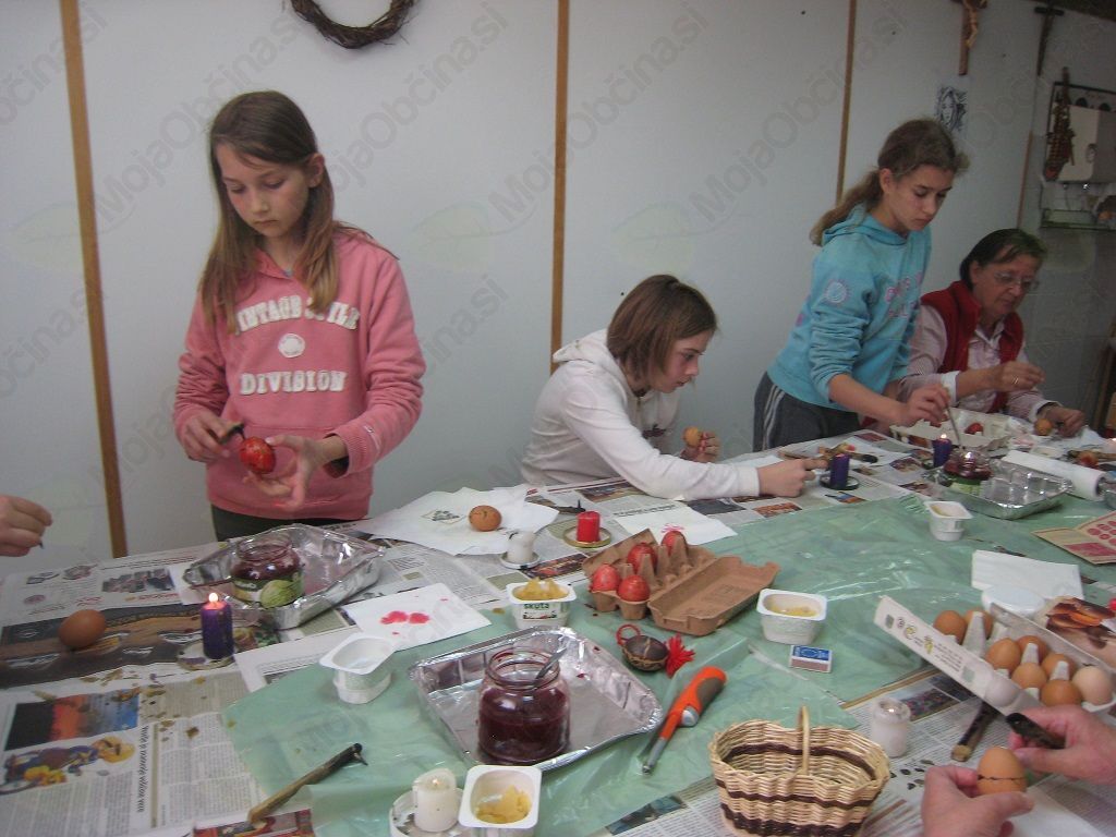 Meta Petrač je tokrat v goste povabila gospo Janjo Zadnikar, ki nam je pokazala tehniko izdelovanja pisanic. Že doma smo izpihali jajca. Na te lupine smo s posebno pisalko, ki pušča sled voska, risali različne motive. Jajčno lupino smo potopili v rdečo barvo, nato smo po njej še enkrat risali in jo končno potopili še v črno barvo. Delo zahteva kar nekaj spretnosti in potrpljenja, nevarno je, da lupina tudi poči. Pobarvane jajčne lupine smo dali še v pečico, da smo lažje odstranili vosek. Nastale so prekrasne pisanice. Navezali smo jih na rdečo volno, da smo jih doma lahko obesili.