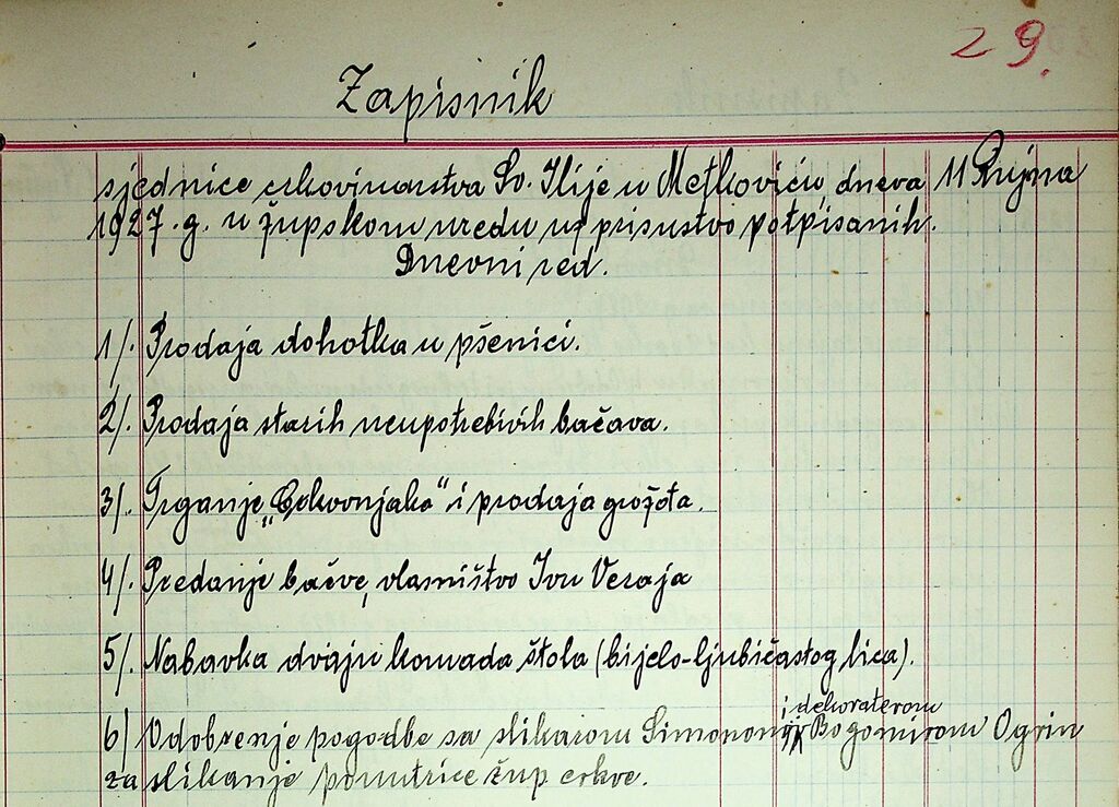 [9] ŽA Metković, Zapisnik sjednica crkovinarstva 1923–1951 [str. 29]. Poskenirane strani mi je posredoval Mario Talajić, njemu pa jih je poslal metkoviški župnik don Mato Brečić.