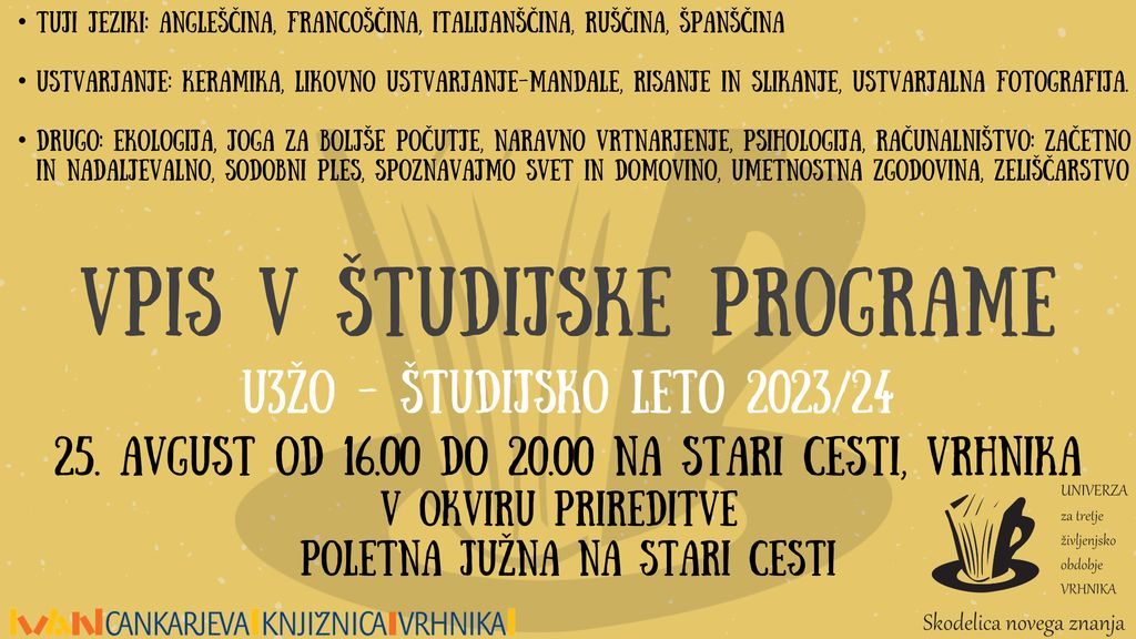 U3ŽO Vrhnika vabi k prijavi v naslednje študijske programe: